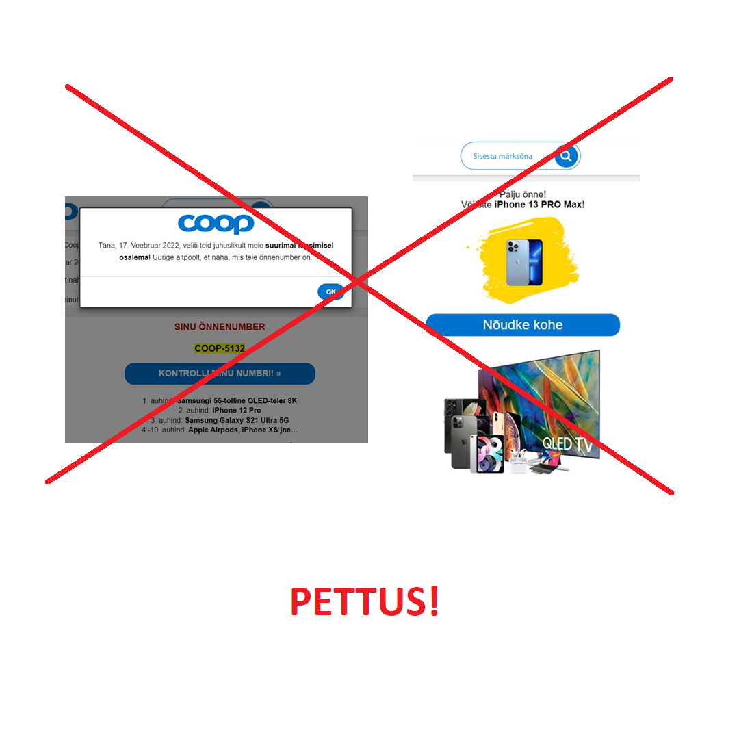 Coopi nimel on sotsiaalmeedias taas levimas pettus, milles lubatakse auhinnaks iPhone 13 PRO MAX. Selle käigus on palutud inimestel ekraanil lotopiletid „kraapida“ ja auhinna kättesaamiseks palutakse sisestada enda kaardiandmed.
