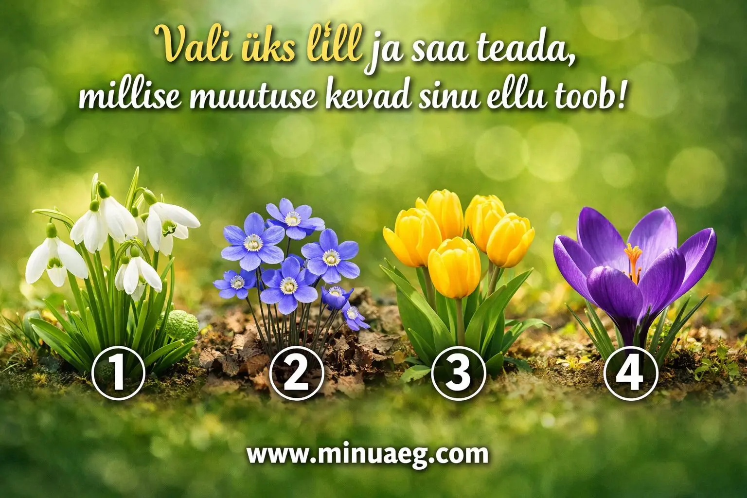 Vaata pilti ja vali üks lill, mis sind kõige rohkem kõnetab. Ära mõtle liiga kaua – usalda oma esimest tunnet. Just see valik võib paljastada, milline energia ja muutus kevad sinu ellu toob.