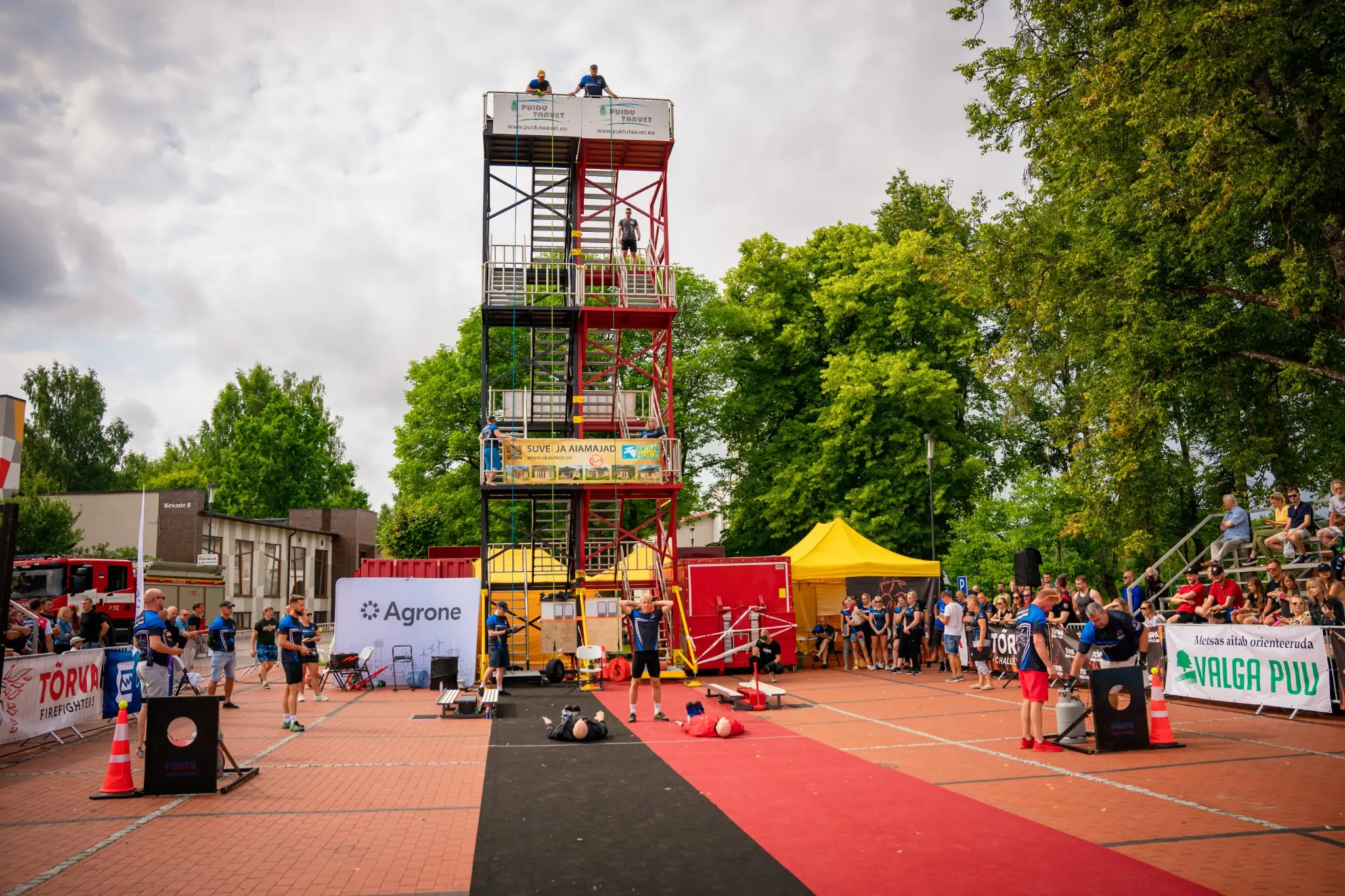 - Võistleja tõmbab torni tippu vooliku rulli ja paigutab selle voolikukasti.