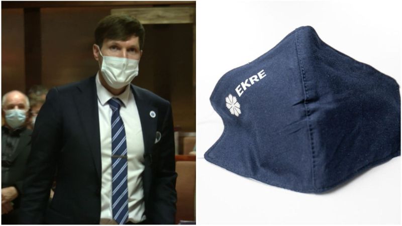 Vaktsineeritud EKRE esimees Martin Helme, kes hindas maski mitte solidaarsuse, vaid valitsusele alistumise märgiks, müüb EKRE veebipoes EKRE logoga kaitsemaske.